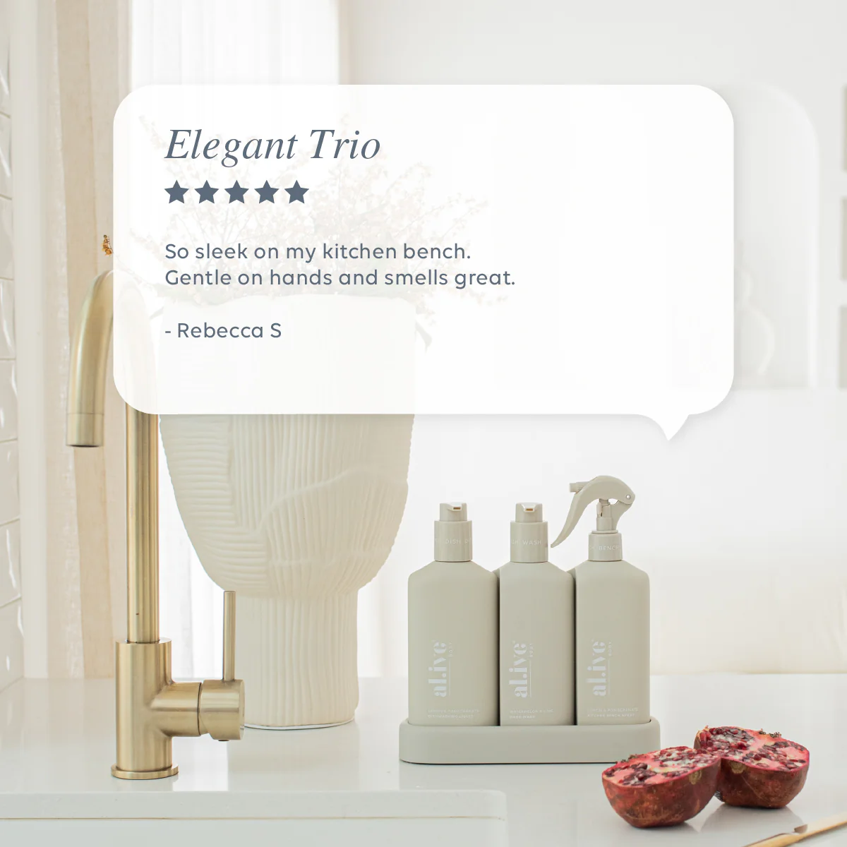 Kitchen Bench Spray:Â Water, Ethanol, Anionic Surfactants (Coconut Derived), Non-Ionic Surfactants (Coconut Derived), Citrus Limon (Lemon) Peel Oil, Punica Granatum (Pomegranate) Fruit Extract, Parfum (Fragrance), Preservatives.